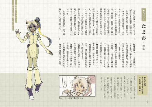 ページ画像の中で一瞬チラッとだけ書きましたが、たまおも妖の血を引いています。猫耳は右側のみ。(はと翡翠の)天冠は治安も教育水準も比較的良い地域で、たまおも見た目の印象以上に教養のある猫女です。