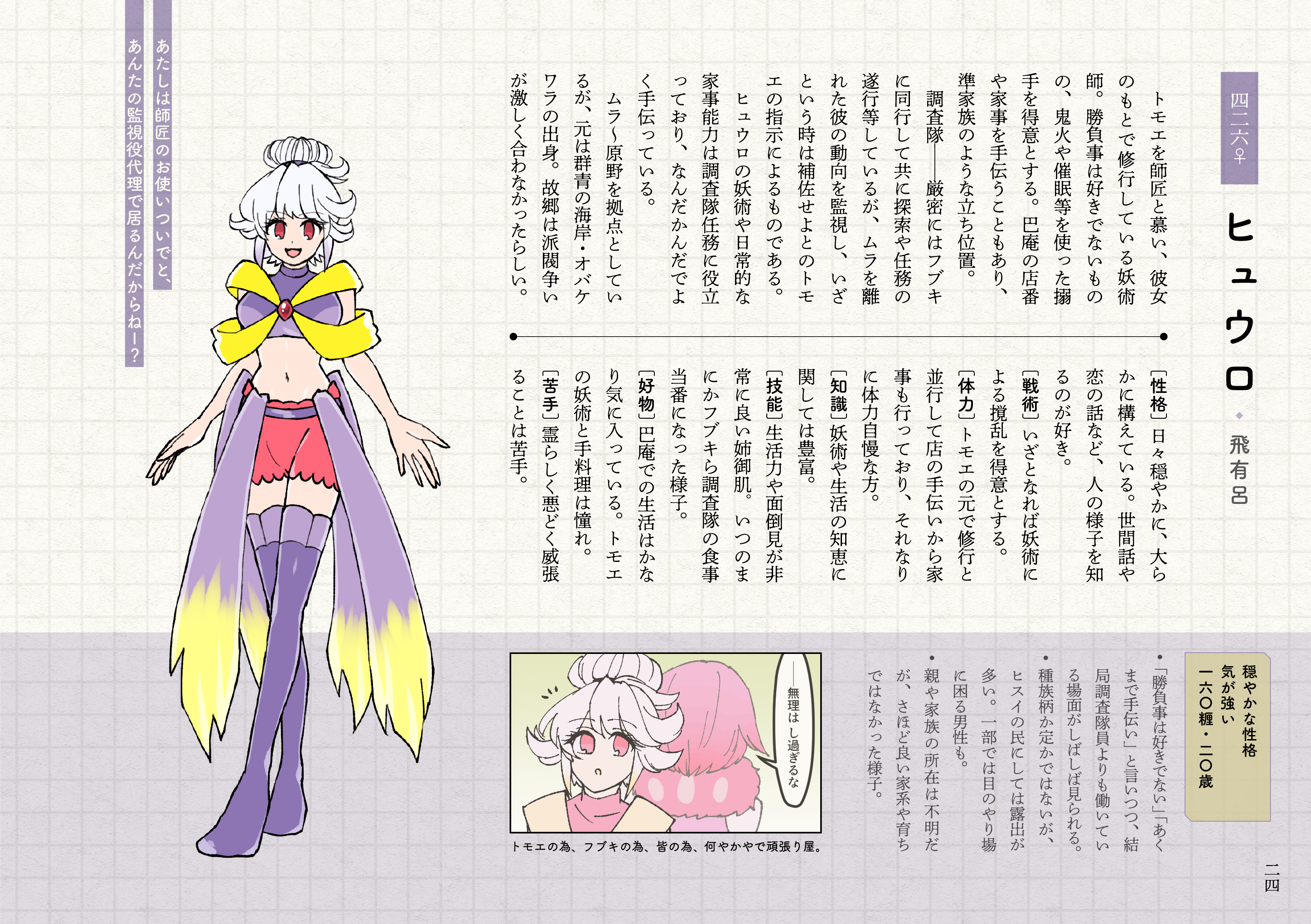 なおシロイチに続いて名前の由来はというと、かえってなんも思いつかなくてオバケだし「ひゅ~どろどろ」の音から取りました。ネーミングに特に規則性はないんです……。漢字では「飛有呂」ですが「呂」が音系の意味を持つので、夜に現れる時は意味深なSEでも流れていそうです(ゲームでも流れますね)。