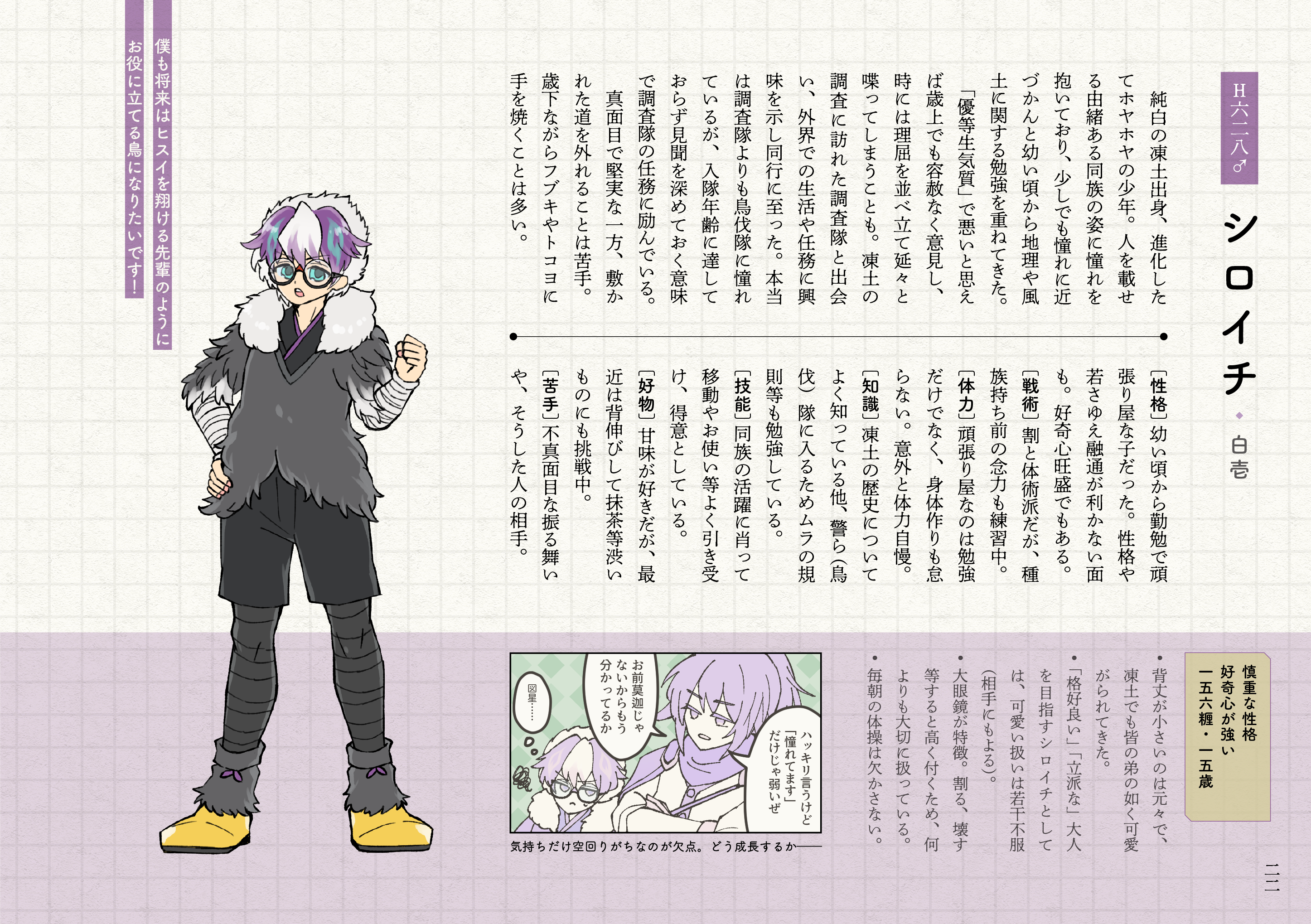 シロイチは年若いため、良い面も未熟な面もひっくるめての彼というキャラだと考えているのであえて若干厳しい表現も入れました。「憧れ」だけで終わらせない、彼自身の成長はひじょうに楽しみです。見た目的にも。