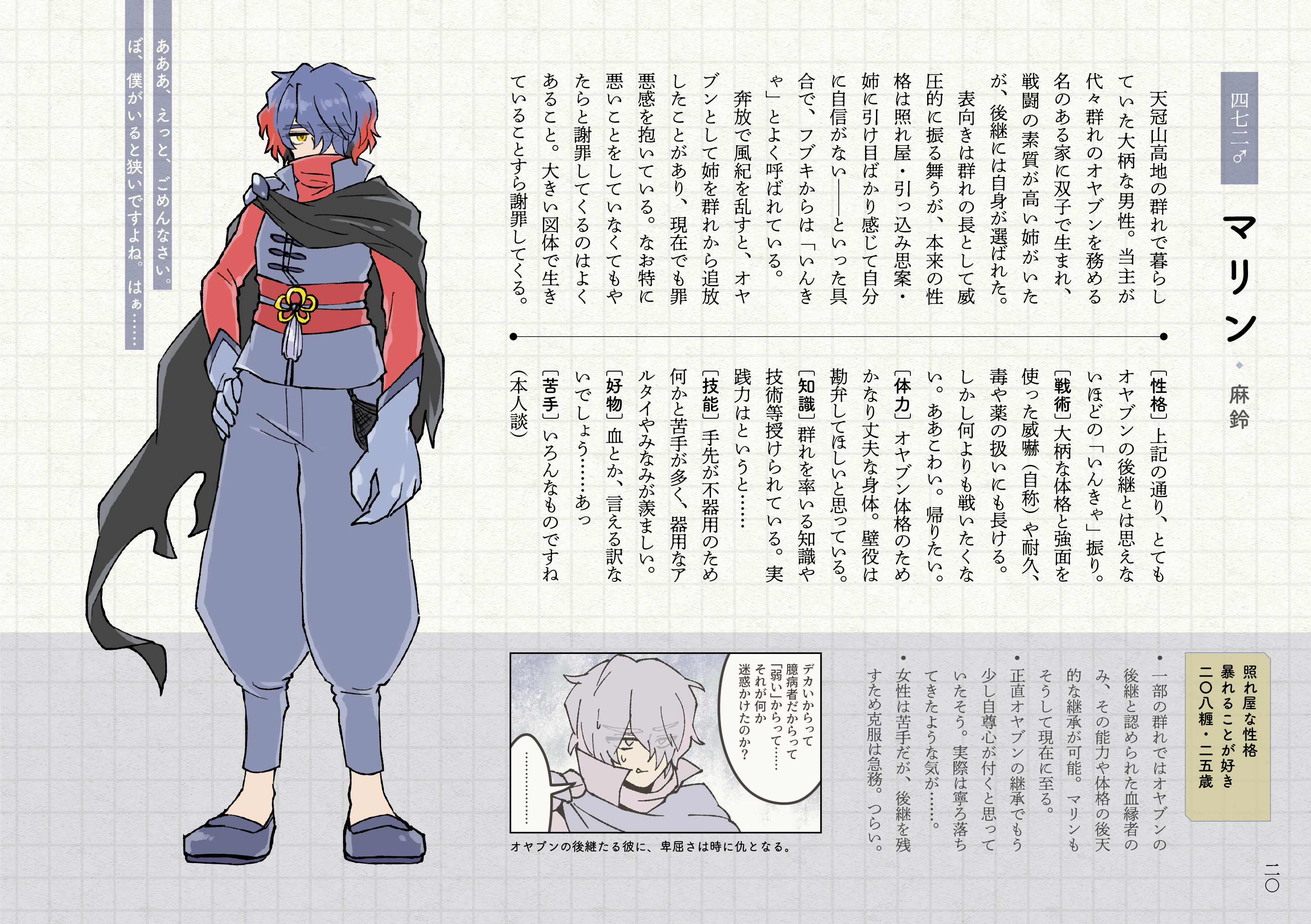 マリンに関しては同じ土地ということで初めからハシュカと縁のあるキャラとして考えていました使いまわ……デザイン的な共通点を持たせつつ、ハシュカ以外の472の子っぽい要素も少し混ぜてみた感じのビジュアルです。そしてオヤブン身長ゆえ細長い。ハシュカは彼からすれば一応子孫か親族の末裔のような子だと考えていますが、顔つきや性格、そして身長があまりにもかけ離れていますね(オヤブンの概念がなくなったとはいえ)。