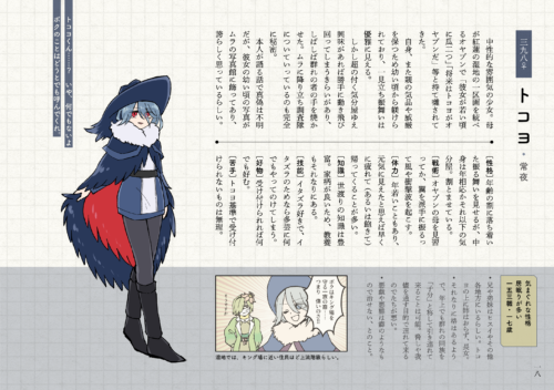 そこまではレイアウトおよび何を入れるか(設定文?ちょっとした情報?画像での詳細はどんな形で?等)を決め、7月からはそれに基づき個別の部品を作っていきました。ペースはこの週までに何人とか、順番も書きたいと思った子から、等ガッチガチになりすぎないようにしました(ただでさえ原稿作業は心が苦しいので、できるだけ必要以上に枷を作りたくなかった)。